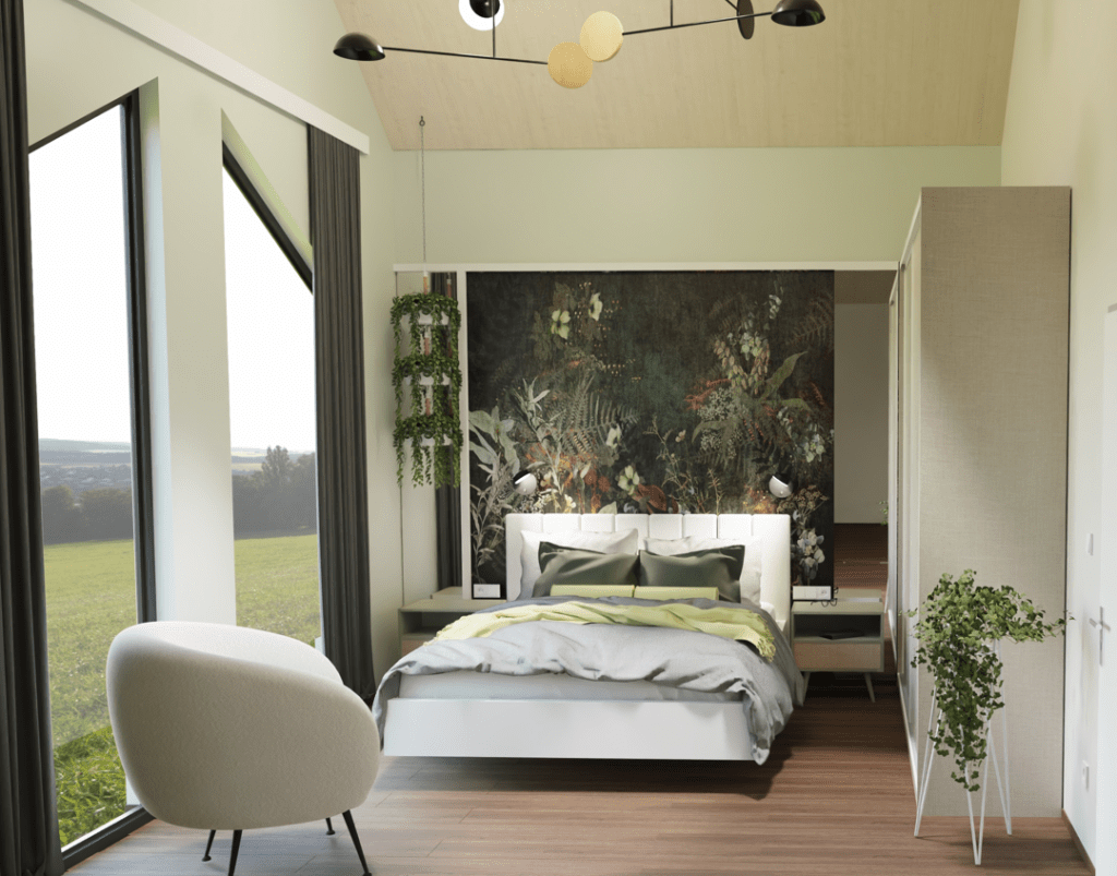 W spełnieniu marzeń klientki pomógł wymarzony fotel w tkaninie bounce, stając się doskonałym miejscem do relaksu. Rośliny znalazły swoje miejsce – jedna na stojaku, a pozostałe pięknie zawieszone tuż obok łóżka, dodając naturalnego piękna.