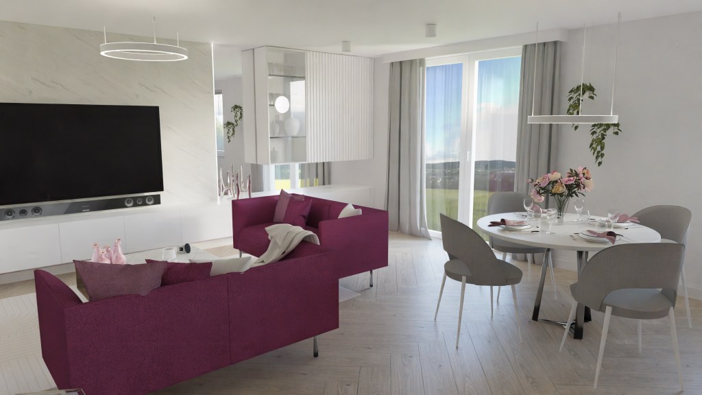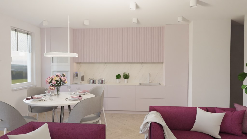 To było prawdziwe wyzwanie, zwłaszcza że chciałam utrzymać równowagę między elegancją a subtelnym urokiem. Wybór padł na ciemne różowe kanapy, które wyglądają absolutnie rewelacyjnie na tle jasnych ścian i podłóg. Aby jednak nie zanurzyć się zbyt głęboko w różowym morzu, zdecydowałam się na jaśniejsze odcienie różu w kuchni. Chciałam, żeby było delikatnie, ale jednocześnie z charakterem.