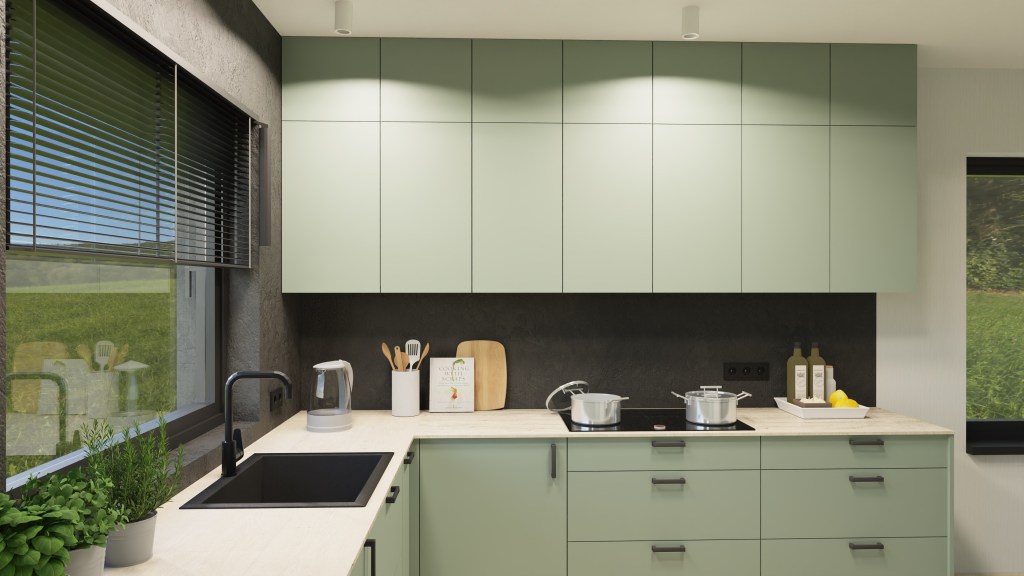 Wyobraź sobie, że Twoja kuchnia jest wypełniona ciepłem i harmonią, jakie niesie ze sobą szałwia. Jasna zieleń idealnie współgra z naturalnymi materiałami i surowym betonem. Dodaj do tego ciemne akcenty, takie jak czarne sprzęty AGD oraz uchwyty do szafek, które wprowadzą nowoczesny kontrast i odrobinę eleganckiego pazura.
