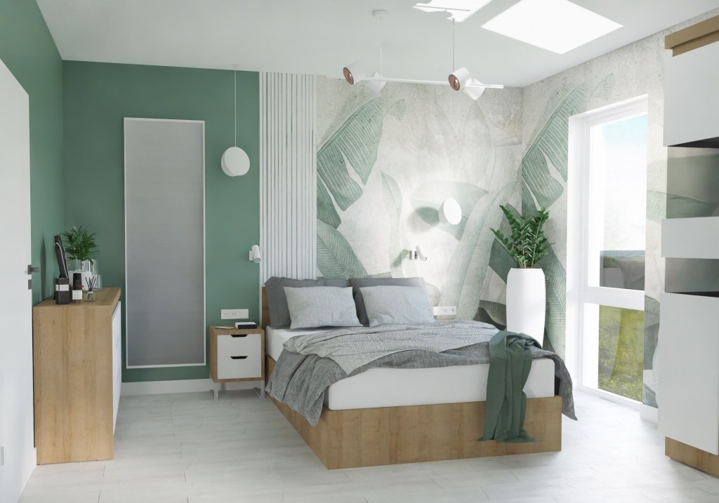 Dwie sąsiadujące ściany zdobi tapeta z motywem liści bananowca, która wprowadza do wnętrza odrobinę egzotyki i sprawia, że sypialnia nabiera niepowtarzalnego klimatu. Szałwiowe odcienie doskonale komponują się z zielenią liści, tworząc harmonijną całość.