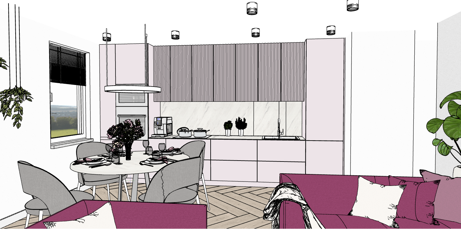 Salon z aneksem kuchennym oplatają różowe odcienie, ryflowane detale i srebrne akcenty, tworząc miejsce, gdzie elegancja spotyka się z subtelnym urokiem. To wnętrze pełne kobiecej siły.